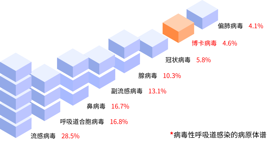 在引起急性呼吸道感染的8种主要呼吸道病毒中,HBoV在全年龄段的阳性率占比为4.6%,其中在5岁以下儿童中的阳性率占比为6.6%;不同疾病类型对比显示,肺炎中HBoV的阳性率占比为6.9%,高于非肺炎疾病。