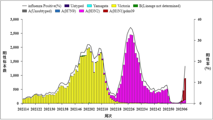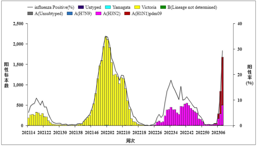国家流感中心发布的2023年第8周流感监测周报显示:近期,南、北方省份流感病毒检测阳性率持续上升,A(H1N1)pdm09为主、A(H3N2)亚型流感病毒共同流行。